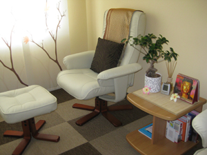 ein überbreites Bett: Ölmassagen finden auf der Massageliege statt und für die Fußmassagen stehen die Sessel bereit. |